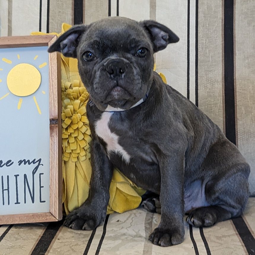 Paul is a handsome Frenchton in a snuggly blue coat. The white streak down his chest is so unique and just adds to his charm! Paul is one playful pup and loves to play chew on the rope and tug of war. He always seems to be ready for one more game with you. We think Paul will be a fun, loving addition into your family!